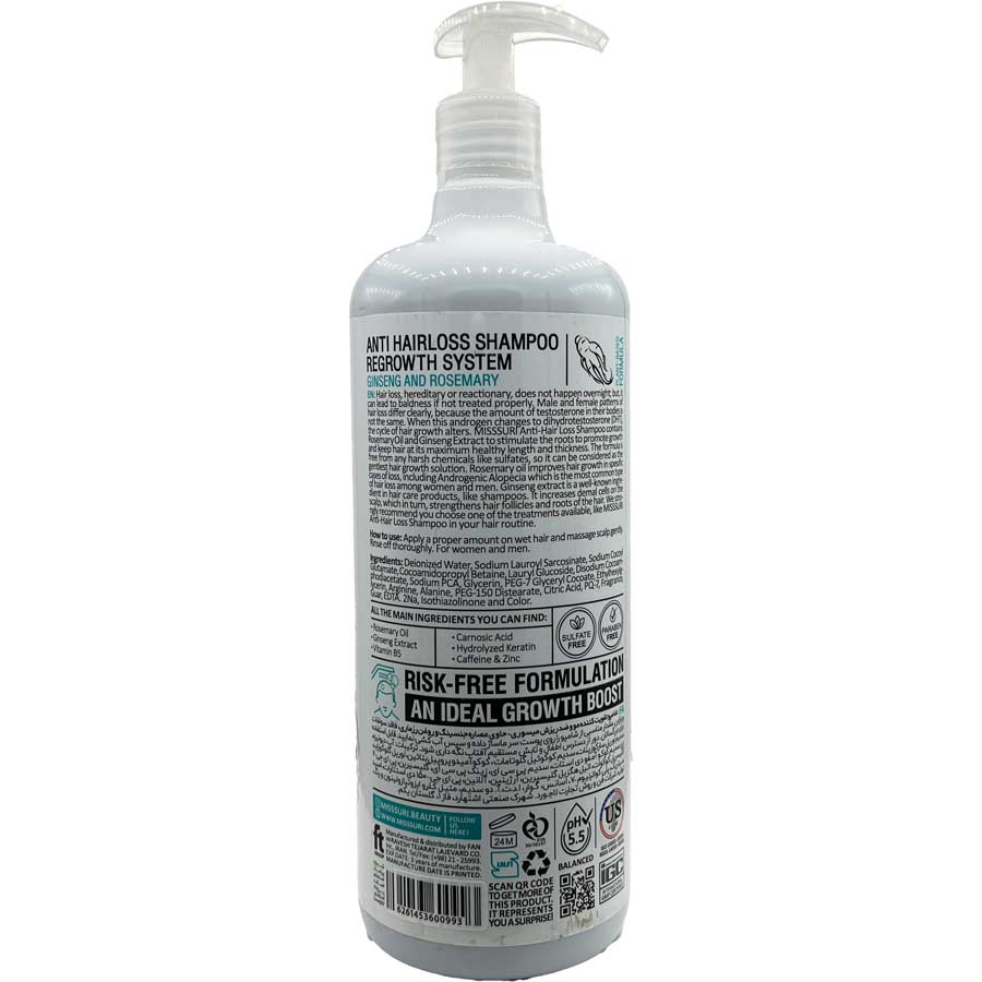 • شامپو تقویت کننده و ضد ریزش مو میسوری  فاقد سولفات و پارابن و حاوی عصاره جنسینگ و روغن رزماری میباشد. شامپو جنسینگ میسوری علاوه بر خاصیت ضد ریزش محرک رشد مو نیز میباشد. وجود عصاره جنسینگ سبب تغذیه عمقی ریشه ، تقویت و ضخیم تر شدن ، رشد مجدد ، حیات بخشی و جلوگیری از شاخه شاخه شدن موها می شود. همچنین روغن رزماری باعث از بین رفتن آلودگی های مو سر شده و با تحریک کنندگی گردش خون مو، از ریزش مو جلوگیری می‌کند. شامپو  موها را تقویت و التیام می بخشد و مناسب برای انواع مو است. این شامپو با داشتن ترکیب ضد ریزش مو موجب تأخیر اثرات پیری زودرس موی سر شده و به این ترتیب، از ریزش مو پیشگیری می کند.