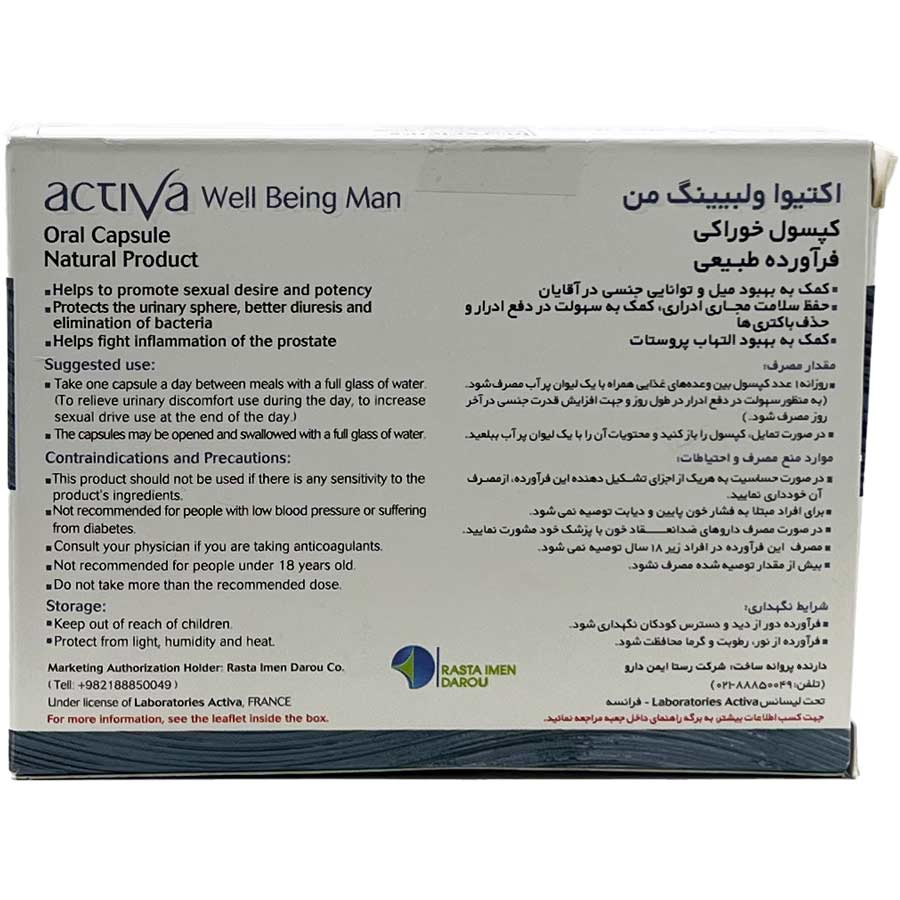 • کپسول اکتیوا من ول بییینگ دربسته بندی 30 عددی تولید رستا دارو ایمن تحت لیسانس لابراتوار اکتیوا فرانسه