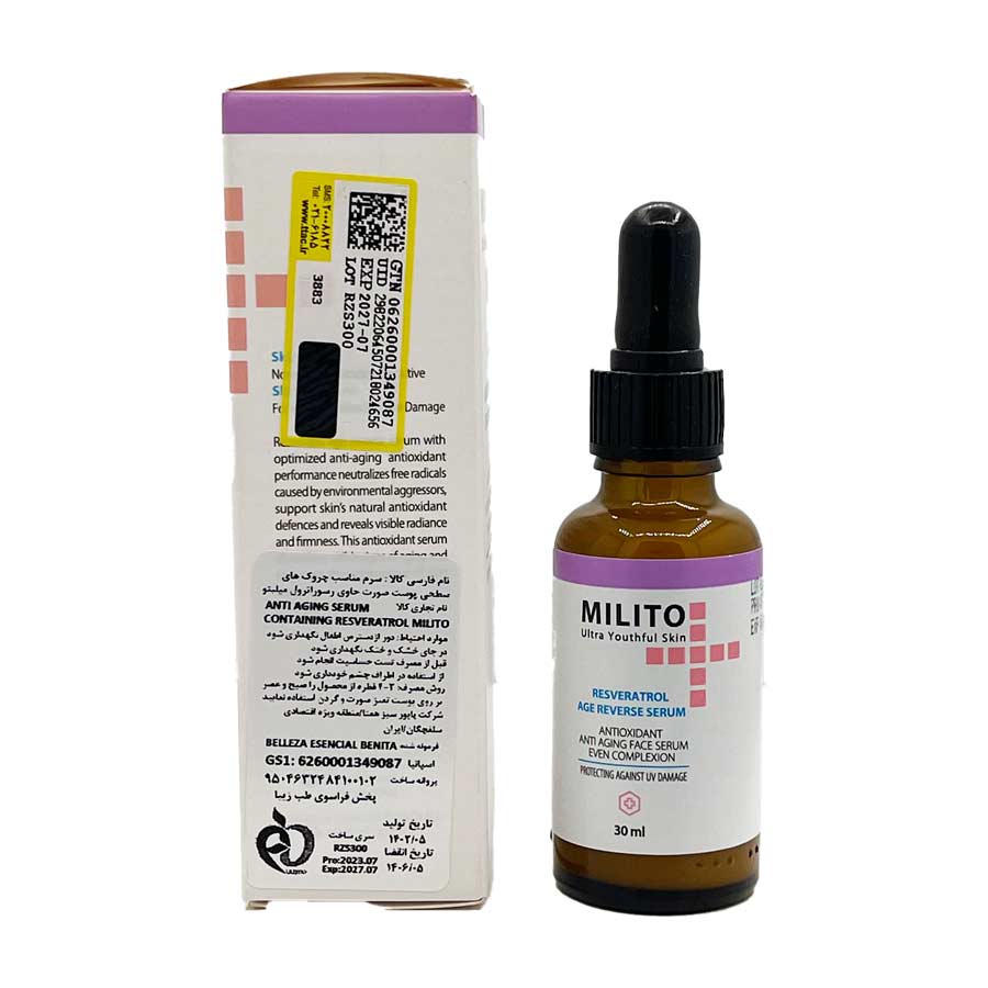 سرم ضدچروک رسوراترول در بستهبندی 30 میلیلیتری تولید شده در کارخانه پایور سبز همتا در منطقه اقتصادی سلفچگان با فرمولاسیون کشور فرانسه و مواد اولیه از کشور فرانسه در دسترس می باشد. جهت خرید این محصول با اطمینان از قیمت و اصالت با چند کلیک میتوانید از سایت فارمیندو اقدام به تهیه سرم رسوراترول میلیتو نمایید. سرم رسوراترول میلیتو به واسطه اثر Even Complexion که در ترکیبات این سرم میباشد دارای اثر یکسازن سازی رنگ پوست بوده و مناسب برای انواع پوست میباشد. از دیگر مشخصه های مهم این سرم