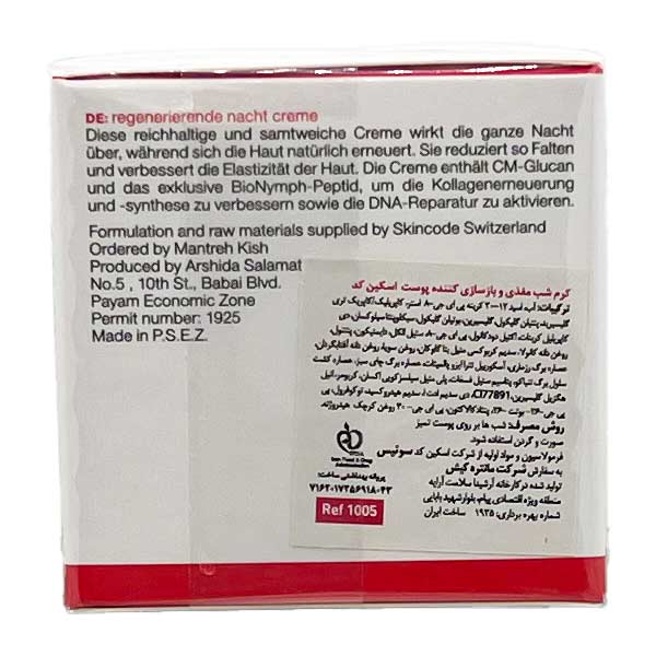 کرم شب بازسازی کننده اسکین کد با بافت غنی ابریشمی و نرم برای عملکرد در طول شب زمانی که پوست به طور طبیعی خود را بازسازی میکند طراحی شده است و به کاهش چین و چروک و بهبود خاصیت ارتجاعی پوست کمک میکند. این کرم حاوی پپتید اختصاصی است تا بازسازی و سنتز کلاژن را بهبود میبخشد. کرم شب اسکین کد بافت غنی و توسعه یافته برای فعال سازی بازسازی کننده پوست در شب پوست را بازسازی میکند و ظاهر پوست را بهبود میبخشد و انعطاف پذیری را بهبود میبخشد. محرک فرایند بازسازی سلولی و کمپلکس انحصاری بایونینف پپتید بهبود دهندهی بازسازی کلاژن و سیستم فعال بازسازی کننده پوست است.